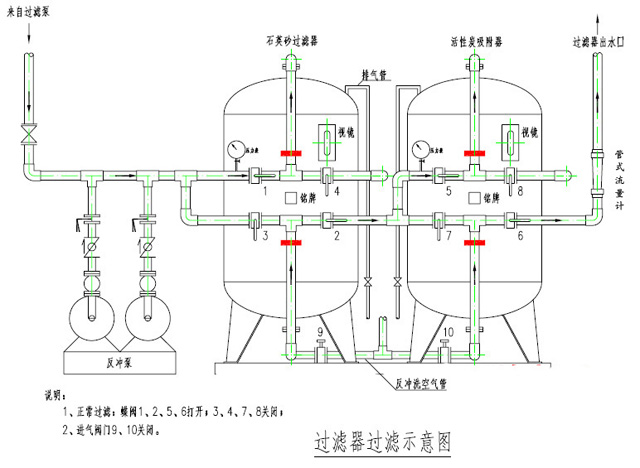 b.恢復(fù)運(yùn)行:關(guān)閉排水閘閥,打開(kāi)進(jìn)水閥和放氣閥,啟動(dòng)進(jìn)水泵,待過(guò)濾器中空氣排除,再關(guān)閉排氣閥,過(guò)濾器即恢復(fù)正常運(yùn)行。